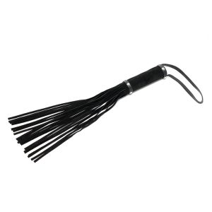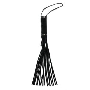 Leather flogger with shorter handle and leather hand loop. The flogger measures 21 inches, the tails are 14 inches.